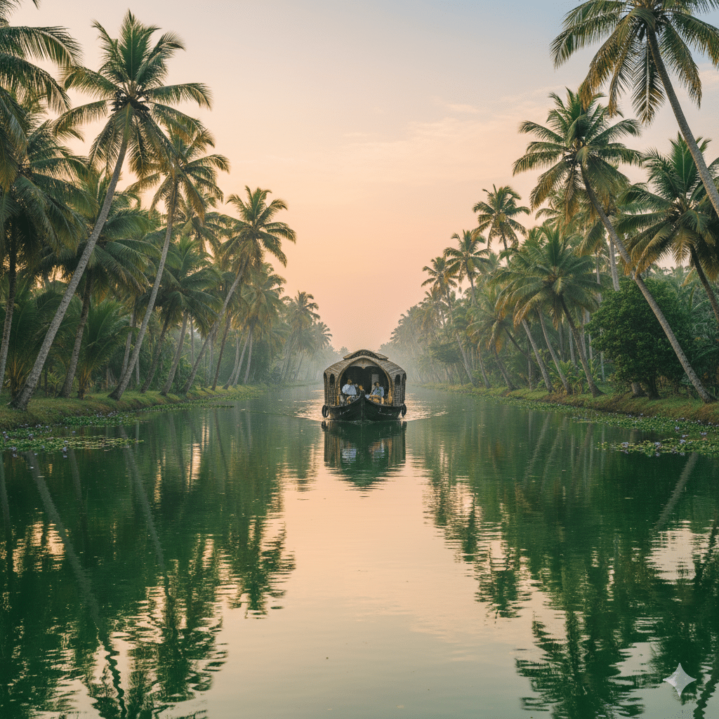 The first rays of dawn spill across the backwaters — golden light dancing on ripples, the air thick with the scent of wet earth and jasmine. A fisherman hums as his canoe drifts by, while your boat stirs gently, ready to glide through paradise.